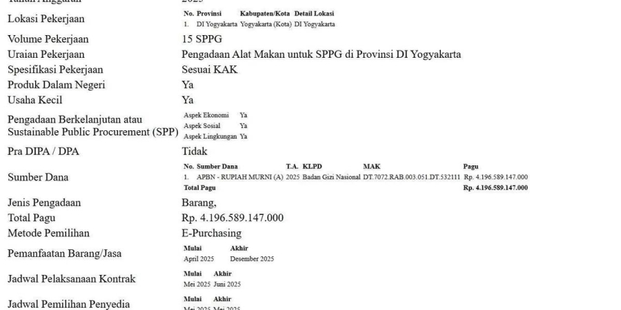 JAKARTA, RIAUSATU.COM — Alokasi anggaran Rp4,1 triliun untuk pengadaan alat makan program Makan Bergizi Gratis (MBG) di Daerah Istimewa Yogyakarta (DIY) memantik sorotan. Nilai tersebut dinilai janggal karena, jika dibagi ke 15 dapur Satuan Pelayanan Pemenuhan Gizi (SPPG), setiap dapur berpotensi menyerap hingga Rp279 miliar hanya untuk piring, sendok, dan perlengkapan makan lainnya. Data Sistem Informasi Rencana Umum Pengadaan (SiRUP) milik Lembaga Kebijakan Pengadaan Barang/Jasa Pemerintah tahun 2025 menunjukkan, pengadaan tersebut menjadi salah satu komponen besar dalam anggaran Badan Gizi Nasional (BGN). Total anggaran program MBG sendiri mencapai Rp71 triliun. Mantan Direktur Yayasan Lembaga Bantuan Hukum Indonesia, Agustinus Edy Kristianto, menilai besaran anggaran tersebut perlu diuji dari sisi kewajaran. Ia membandingkan, biaya pembangunan satu dapur diperkirakan hanya Rp1 miliar hingga Rp3 miliar, jauh di bawah nilai pengadaan alat makan per dapur. Ia juga menyoroti potensi ketimpangan antara nilai anggaran dan kebutuhan riil. Dengan asumsi harga satu set alat makan sekitar Rp100.000, total anggaran Rp4,1 triliun setara dengan sekitar 41 juta set alat makan. Jumlah tersebut dinilai jauh melampaui kebutuhan penduduk DIY yang berkisar 3,7 juta jiwa. Jika pengadaan tersebut didistribusikan ke 15 dapur SPPG, maka setiap dapur berpotensi menerima jutaan set alat makan. Kondisi ini memunculkan pertanyaan terkait kapasitas penyimpanan, distribusi, hingga efektivitas pemanfaatan barang dalam operasional harian. Selain volume, aspek waktu pelaksanaan juga menjadi sorotan. Berdasarkan jadwal dalam SiRUP, proses pengadaan berlangsung dalam rentang Mei hingga Juni 2025. Dalam kurun waktu sekitar dua bulan, distribusi puluhan juta set alat makan dinilai membutuhkan dukungan logistik dalam skala besar. Perhitungan sederhana menunjukkan, pengangkutan barang dalam jumlah tersebut berpotensi memerlukan ribuan perjalanan truk kontainer. Hal ini dinilai menambah kompleksitas pelaksanaan proyek, sekaligus menimbulkan pertanyaan mengenai kesiapan rantai pasok. Dari sisi regulasi, Agustinus juga menyinggung klasifikasi paket pengadaan yang tercatat untuk usaha kecil. Ia menilai, penetapan tersebut perlu dikaji lebih lanjut karena nilai paket yang mencapai triliunan rupiah umumnya tidak diperuntukkan bagi kategori usaha kecil dalam ketentuan pengadaan barang dan jasa pemerintah. “Perlu ada penjelasan terbuka mengenai dasar perhitungan, spesifikasi barang, hingga mekanisme penentuan penyedia,” ujarnya, pada Ahad, 12 April 2026. Hingga kini, pihak Badan Gizi Nasional belum memberikan keterangan resmi terkait rincian kebutuhan maupun skema pelaksanaan pengadaan tersebut. Minimnya transparansi ini mendorong munculnya desakan agar dilakukan audit dan penelusuran lebih lanjut. Sejumlah pengamat menilai, besarnya anggaran dalam program MBG harus diiringi dengan tata kelola yang akuntabel. Tanpa itu, potensi pemborosan hingga penyimpangan dinilai sulit dihindari, terutama dalam proyek dengan nilai besar dan waktu pelaksanaan yang relatif singkat. *** Sumber: https://www.riausatu.com/peristiwa/42916983232/rp41-triliun-untuk-alat-makan-mbg-di-diy-satu-dapur-capai-rp279-miliar